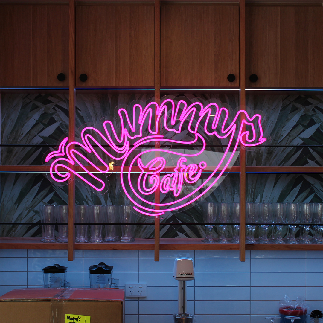 Cue Signs crafted two custom neon signs for Mummy's Cafe in Aura, QLD. The vibrant "Mummy's Cafe" logo welcomes guests at the entrance, while the charming "Meet You at Mummy's" sign inside adds a cozy touch. These eye-catching designs enhance the cafe's ambiance and have quickly become Instagram-worthy features, boosting social media engagement.